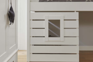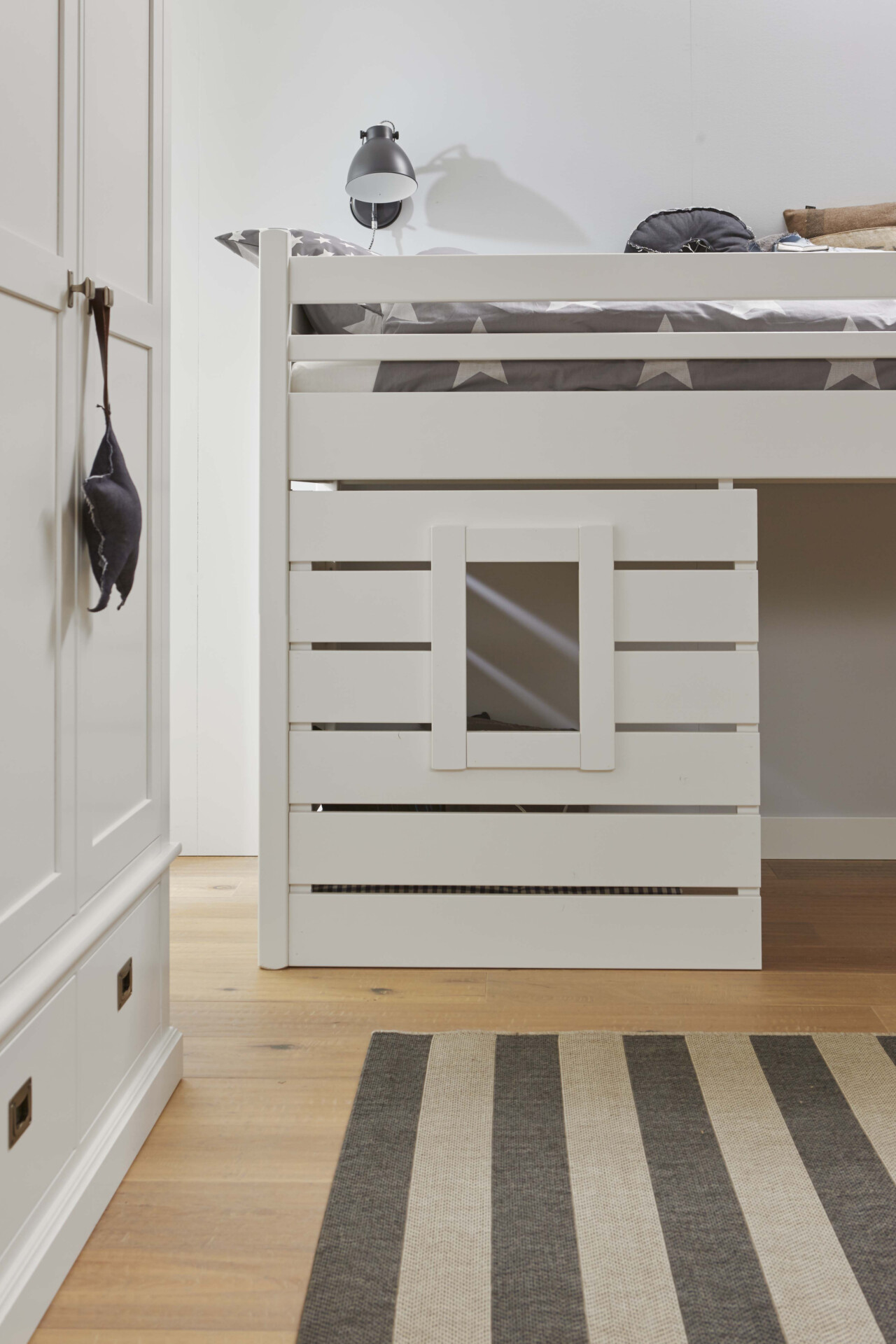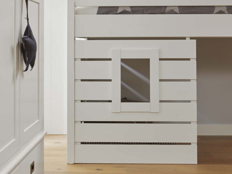 Met een beetje fantasie waan je je in zomerse sferen met dit hutbed. Door de uit latten opgebouwde wanden met een groot venster heeft de hut een beach house uitstraling.